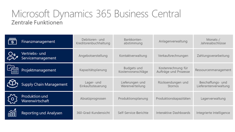Microsoft Dynamics 365 Business Central bietet vollständig integrierte Funktionen für alle Geschäftsprozesse mittelständischer Unternehmen.