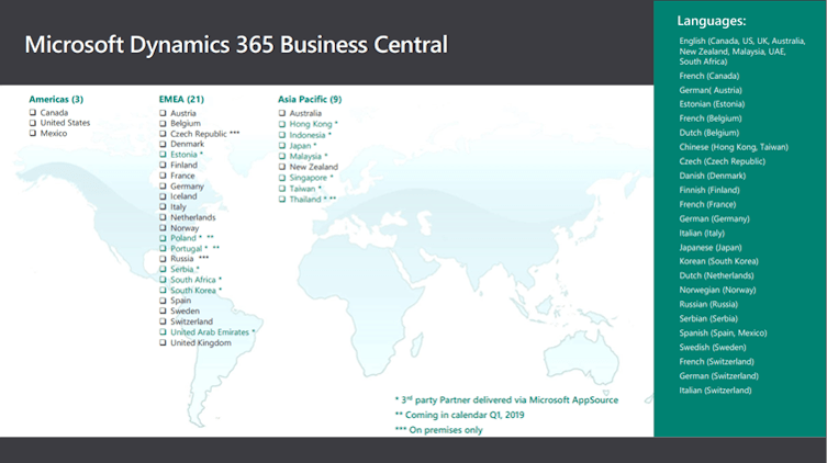Microsoft Dynamics 365 Business Central ist eine weltweit eingesetzte ERP Lösung. Im Jahr 2023 wird die Software in über 150 Ländern eingesetzt. Die Software ist für die im Schaubild aufgezeigten Ländern verfügbar.